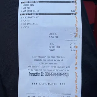 Burger King actually kind of came in clutch. After having some really bad food, I just needed some food that would be decent. I ordered an impossible whopper burger with a drink. And the half French fries and half onion rings. The fries and onion rings were good. The whopper with cheese, was alright. The tomatoes were not fresh. They were white in color. But other than that, it tasted fine. I liked the cute message on the receipt.