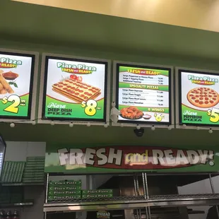 I love getting pizzas here they have great family deals very clean place and friendly staff the pizza are extremely fresh and great taste they work very fast on your orders too definitely recommend this place in very convenient .
