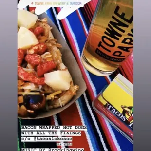 Bacon wrapped hotdog with bell peppers, pineapple chunks, hot Cheetos, cheese and our famous chipotle cream sauce