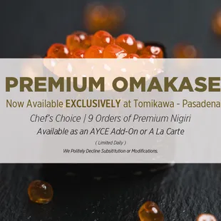 The absolute BEST AYCE sushi restaurant in Pasadena. I have been coming here weekly for the past several months, and the consistency in their dishes is excellent. All the staff are friendly, attentive, and helpful. The restaurant itself has fantastic lighting, seating, and great music. The food is incredible. The raw fish is ALWAYS fresh and super tasty. My personal favorite order is their omakase set--a 9 piece platter that includes fresh, unique, and delicious sushi, such as Uni and Toro nigiri, for only $10 on top of their AYCE price. Additionally, they have a great selection of appetizers that are all delicious and portioned perfectly. While their sushi is fantastic, their cooked food is great too. The Yellowtail Collar is ridiculously tender and comes in a generous portion. I would highly recommend this dish for anyone who enjoys grilled fish. Overall, Tomikawa is a rare gem in Pasadena and would recommend anyone who appreciates good quality sushi and reasonable pricing to try this place!!!