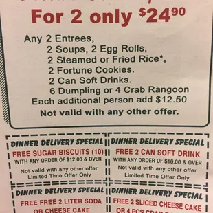 I'm gonna give this place 3 stars since I can't leave 3 and a half for what it is,a solid place to get cheap and filling Chinese food delivered,they're fast and the whoever takes my order is always polite efficient and patient,very good COVID awareness by the delivery drivers and the most of the food is pretty damn good.We get the special for 2 that comes with 3 egg rolls 4 crab rangoons 2 can sodas 2 soups and 2 entrees for I believe 33 bucks after tax,we got Kung POW beef and orange chicken as the entrees,I really like the Kung POW beef it's got a little spice to it but not to much and there's a really great mix of veggies,the orange chicken was ok but tends to get soggy very fast,the sweet in sour chicken was basic not really different than any other place,I really like the chicken Lomain the sauce was good and the portion is nice.all in all we will be ordering from here again.