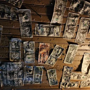 Dollar bills on the ceiling and walls. Early evening so not very crowded.