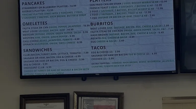 Famous George's is a pretty cool Mom and Pop restaurant, in the area where they're really aren't many places to eat but a lot of businesses. there really isn't anything glamorous about it from the outside... Matter of fact it took coming to this area to work a few times before I realized it was a restaurant. They open early enough for breakfast, and stay open through the evening. But I have only ever been there for lunch.It is difficult to tell exactly what they specialize in, because they have food from different types of cuisine: American, tex-mex, even Mediterranean. I'm not complaining since I like them all... The last time I went for lunch I had a chicken quesadilla (to be honest I think the first time I went I did too), and fries. The food is relatively inexpensive, and definitely a lot of bang for your buck because they give you huge servings and the quality is pretty good. My quesadilla came with sour cream and salsa, and I got ranch for my fries. It was definitely a lot of food, but my quesadilla was really really good. I think this is a nice spot if you're in the area and looking for something to eat for breakfast or lunch.