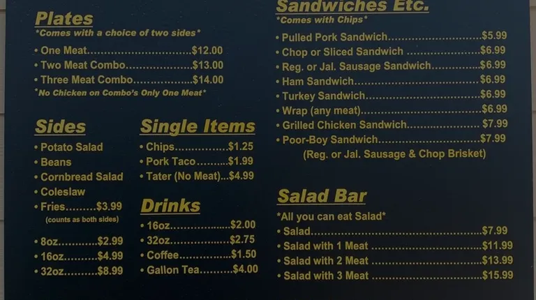 Great find! This location didn't show up on Yelp on our search. We stopped because we saw a packed parking lot (was already past regular lunch time). Service was fast. Had jalapeno sausage, turkey and brisket. The meat was all great! Salad bar had many toppings. Only draw back was that fries counted as 2 sides and the serving wasn't very large. We aren't from the area but if we were we would definitely stop in often!
