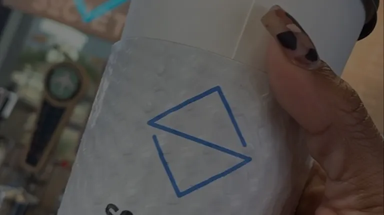 a coffee cup with a sticker on it