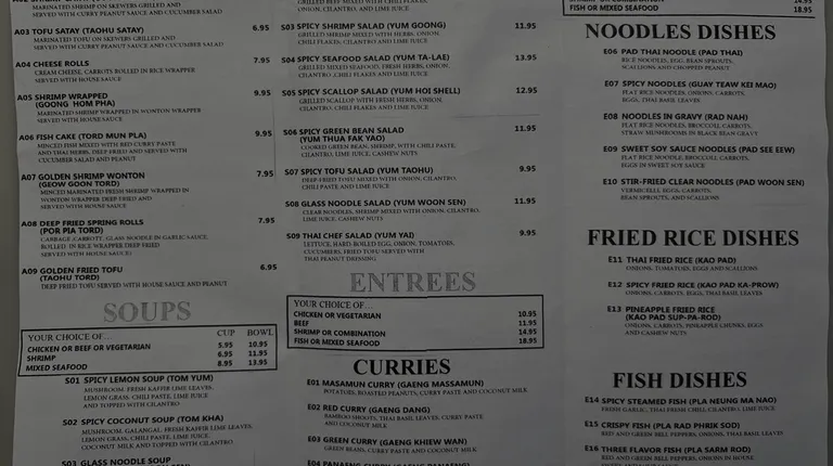 Only a few blocks away, its my go to Thai restaurant. Been a patron for 15 years. Have had all the appetizers, most of the soups, the curry entrees, pad thai, and the pineapple fried rice. All delicious and no complaints. Plus its BYOB if you want to eat in.
