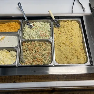 *Delicious BBQ Sides* -BBQ sides including creamy potato salad, tangy coleslaw, tasty pasta salad, and butter, sour cream, and cheese.