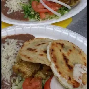 Served with lettuce, sour cream, avocado, beans, white cheese, onion, and tomato.