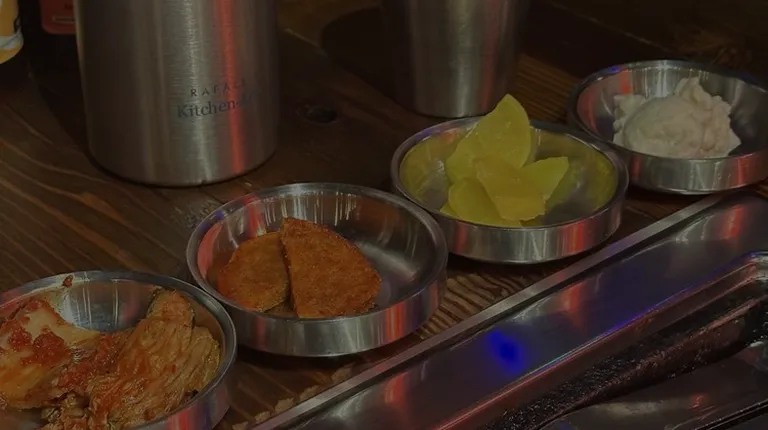 Be sure to visit when you are hungry because all you can eat is plentiful and you cannot take any leftovers with you. Rib-eye, pork belly, chicken, spicy pork, brisket, and short ribs (dinner only, one serving) comes with unlimited sides of potato salad, rice, kimchi, daikon, fish cakes, kimchi pancakes and rice. Use onion and pineapple to flavor your grill before placing your meat on it to cook. Service was attentive and fast. When one of our grill tops got too hot and charred, a replacement was brought out. I also like how their water pitchers and glasses are made of stainless steel to keep your beverage cool. Be prepared for meat sweats because DAE Gee's slogan - Pig Out, is no joke.