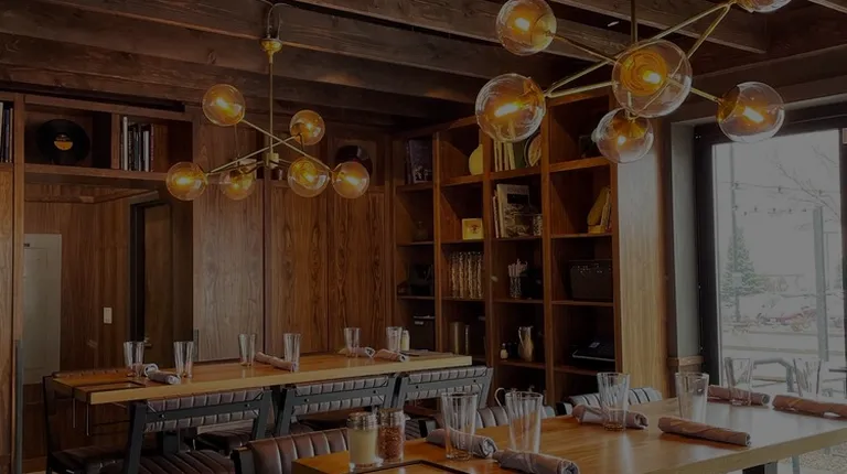 The aesthetic of the restaurant is ski lodge inspired with rustic ski equipment, exposed wood beams, metal light fixtures and warm tones