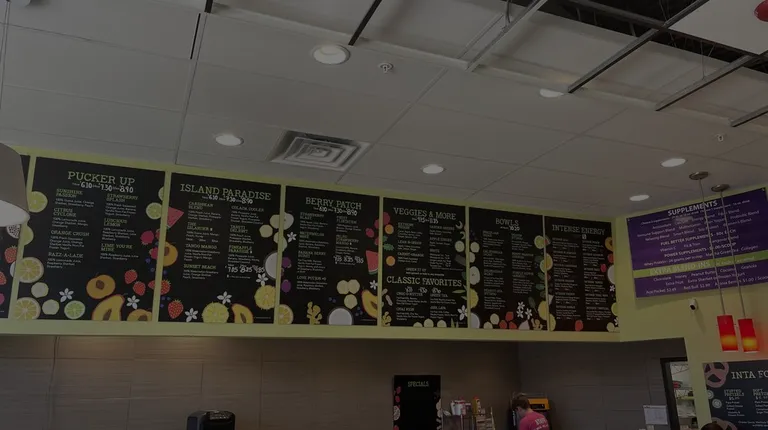 A large smoothie selection but definitely a to-go smoothie. There is 4 rickety stools and that's it, no music, no place to sit and enjoy smoothie. Service was fine, just not a space to chat & sit.