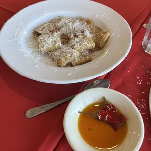 Rigatoni, meat of the day (braised beef) and stuffed ravioli