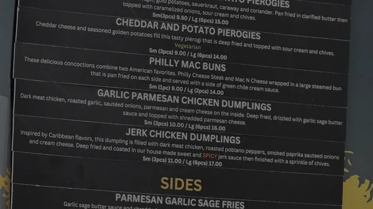 Wow! After seeing the menu, we had to check them out. And we were not disappointed! I had a full order of the jerk chicken dumplings based on their recommendation. They were tasty and had a bit of a kick - spicy but not unbearable. My husband had a small order of the cheddar and potato pierogies. We also shared the Parmesan garlic sage fries. The fries were excellent - crispy to hold up to the garlic sauce it was covered in. Everything was delicious. Next time I would only order a small order ... it was more than enough. Though the leftovers made for an excellent lunch the next day. My only minor complaint was the silverware. They weren't sturdy enough to cut the dumpling edges.