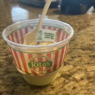 Went to Rita's yesterday after dinner around 9pm. We got 2 large custard bowls that was not even half full. This picture is after eating 4 spoons. As you can see it is not what is advertised. For $6 you should come close to filling the bowl. Custard tasted good but not worth the price if you 1/2 your portions.