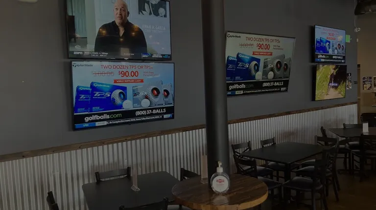 a table and chairs in a sports bar