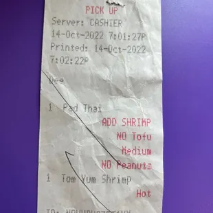 Pad thai. Thai hot, not spicy. Asked to get skrimp instead of shitken.. they charge extra $3.50. Wtf?