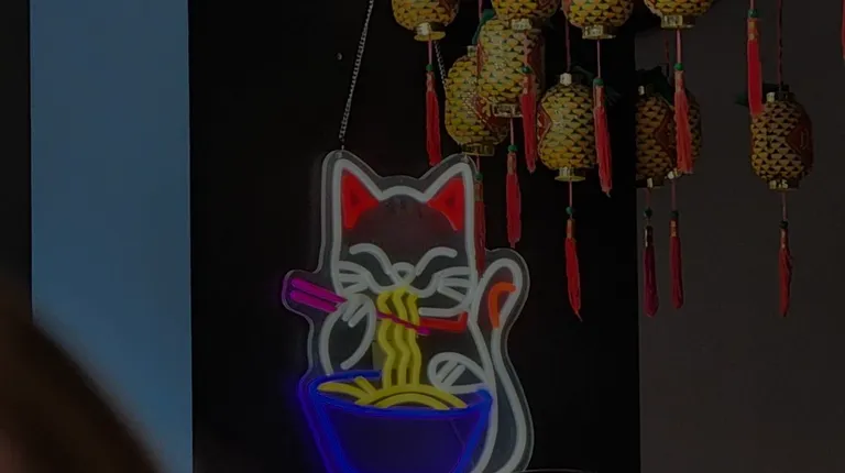a large group of people sitting at tables with red paper lanterns hanging from the ceiling