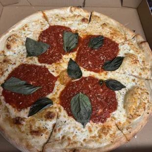 Pizza crawl no. 14: Got a Margherita pie for takeout. Their 18" pie is a normal sized pie in NY/NJ, not those little 14" pies that many shops around here sell for almost as much money.What I liked: 18" pie = foldable slices; light, super flavorable sauce and mozz; plenty fresh basil.What I didn't like so much: wayyyy too much cheese (I know there can never be enough cheese, right); not enough sauce (there was a layer of cheese on dough but not enough splashes of that great sauce on top of cheese); a tad too oily from cheese; dough was pretty flat and dense, no air from fermentation so edge was somewhat hard) but undercarriage was actually well done.This was a good pie but not sure I'll order again although older parents did enjoy very much.