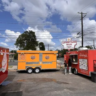 I've heard of this food truck that makes baked potatoes! SAY WHAT? In love. I came around 3pm today and I'm so happy I did. The menu is straight forward. And the prices are decent, to the size of potatoes you get. They only take cash, so I was actually limited on what I could get. They did say there is an ATM inside, but, who knows what kind of fees. So I got what I could with the cash I had on me. Loaded baked potato it is. It was delicious. Large baked potato, soft and hot, lots of shredded cheese on it and real chunks of bacon. The bacon was wonderful. And I got a packed of sour cream. Wish I had more, but it was very good. It's a little drive for me, but I didn't mind a little road trip. They do have a small parking lot. And several picnic tables that are covered. I didn't go inside to see what that was. Maybe inside seating? Not sure. I really enjoyed it.