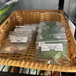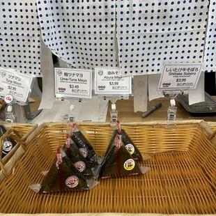 a display of sushi rolls in a basket