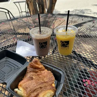 a croissant and iced coffee on a table
