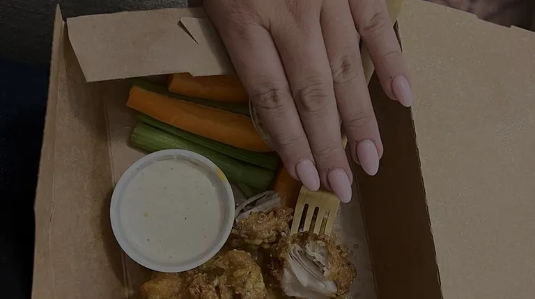 a takeout box with chicken wings, carrots, celery, and a dip