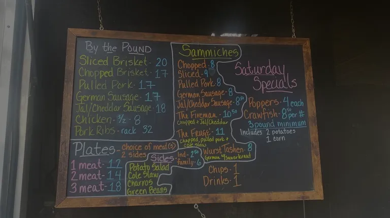 Excellent BBQ!!! We had the chopped brisket sammiches with charro beans and extra BBQ sauce. So good we took our aunt the next day for lunch so hubby & aunt had the chopped brisket sammich with charro beans and I had the jalapeño sausage. Excellent again!! Went back Saturday for his crawfish and aunt wanted to take a few of his chopped brisket sammiches home! Highly recommend :)