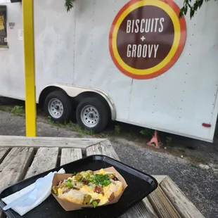 Biscuits, gravy, sausage, thick sliced peppered maple bacon, home fries, Colby Jack cheese and chives.