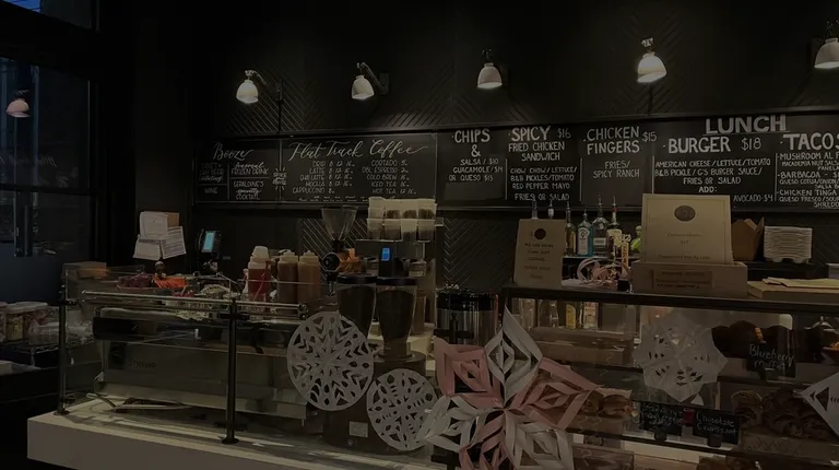 a coffee shop with a menu on the wall