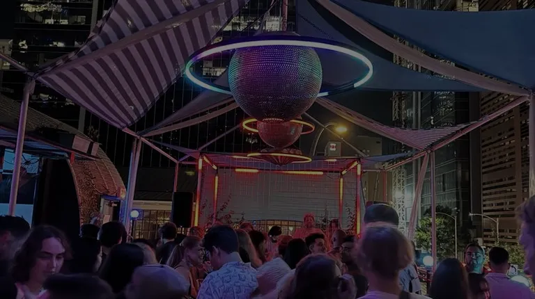 a crowd of people at a rooftop bar