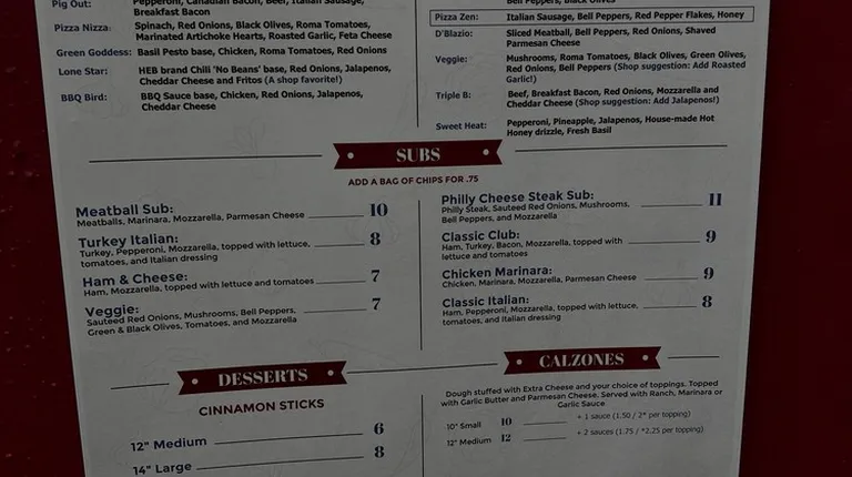 A nice pizza and has the small town charisma going for it, but I don't think the product we got was worth the price charged. Good sauce but the toppings were chewy and didn't offer much flavor. The crust was too thin to get a good fold or to stand up for the weight of the ingredients. In an effort to keep things easier, I'm sure, they don't have a soda machine, or even a water pitcher. However, a can is only a buck fifty so it isn't the end of the world. The service left something to be desired, with the only redeeming quality being that they held back the pie to let it cool, letting us know so. Overall, I like the atheistic and charm, but we likely won't return so many options for 'za in near by San Marcos.