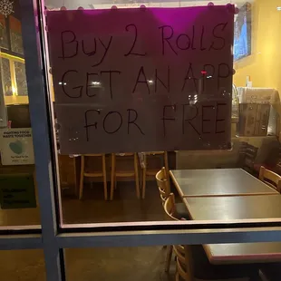 My wife and I each got 2 rolls and got the free shrimp tempura appetizers. The sushi rolls were really tasty and the tempura appetizer was crispy and was a big box of shrimp!