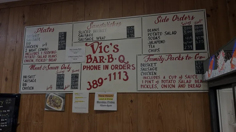 I went to Vic's on Friday February 23 2024 I spent $64.54 $16.34 on brisket two sausage link $10.70 and $18.62 on 4 pork ribs $3.25 small beans, banana pudding and ice tea $2.75 = $57.76 $4.77 tax than another $2.03 to process payment. All 3 meats was so grease I could not even eat it,so I didn't want to waste $64.56 so I tried to boil it ,it was still grease money just wasted now the banana pudding was just that it had two cookies on bottom and two on top,no bananas the beans was OK but I am so disappointed Vic's had real good food once a point in time now the don't even care they use to give you real lemons for your tea now they give you fake pack of lemon juice. I spent to much money to get this type of purchases from Vic's they lost my business. A little grease is OK but the grease pouring off the meat and just un eat able. So disgusting so disappointing