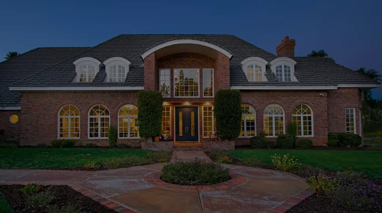 an aerial view of a home at sunset