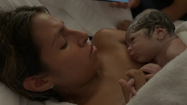 A mother holding her newborn baby that was born in the water at the birth center.