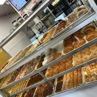 a display case filled with donuts
