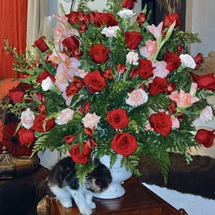 Large sympathy bouquet with soft pops of color. Another great suggestion with excellent delivery.