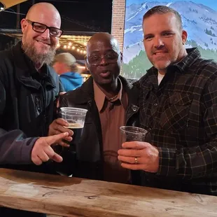 three men holding beer glasses