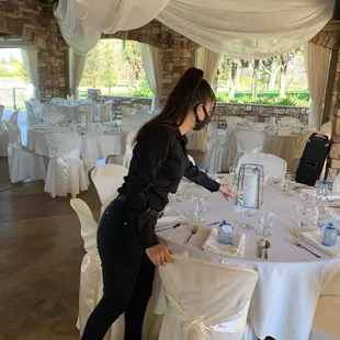 Setting up linen, silverware and favors marking sure everything looks nice and neat