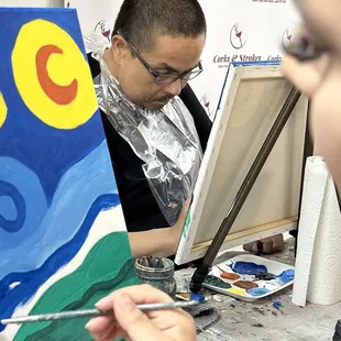 Came here in support of KCSHRM's Scholarship fundraiser. For a studio this size, there must have been at least 30 or more painters. Of course, it wouldn't be Corks & Strokes without bottle of wine. Nyoka was our artist teacher for the evening. She was patient and knowledgeable, which made the 2-hour session go by fast. Nyoka had many tips and tricks on how to recreate the right strokes for the piece. Our HR team had a great time bonding while exercising our creative freedom.