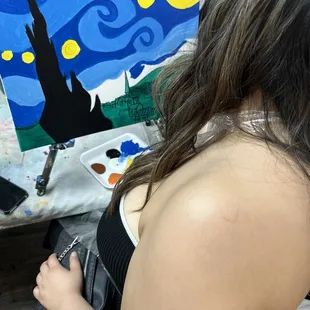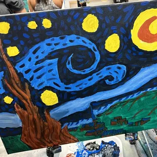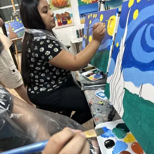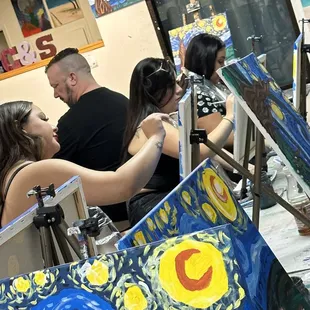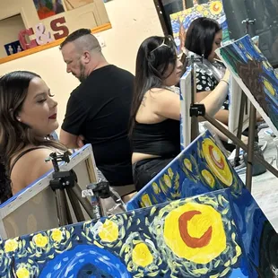 We took the girls for a fun paint night for our Team Building and we had so much fun. I have never done a paint night prior to this so this event was very unique. I truly loved that we all tried to paint Starry Night and that mine was the closest thing to Van Gogh's painting... haha *wink *wink. I felt super focused and super dedicated to making sure my creative eye saw what Van Gogh was trying to capture haha.Anyway, we registered online which was very easy. We received a confirmation and when we got there and unfortunately we got there late because we could not find the building for the life of me. We finally found it in the back alley and by the time we got there we were late and everyone was super ahead of us, but they quickly checked us off on the list and we didn't get to sit together because we got there late...... so my advise to you is to make sure you get there on time so you and your party can all sit together, or at least scoot down when you see an empty seat between you and another party as a courtesy. in any case, we weren't that far from each other so we still had a nice night.You are allowed to bring alcoholic beverages, non-alcoholic beverages, snacks, foods or desserts while you paint and you can also purchase from them if you forgot to bring your goodies with you. After you're all done with your painting and you take pictures with your party then you can see all of the pictures posted on their website.I highly recommend this for a group event, team building or even birthday parties if you like painting. I think this idea is great! The staff is also great, they are super helpful and friendly. If you get lost, which most of my party did... you can always ask for help and they will help you fulfill your inner Van Gogh. :-)