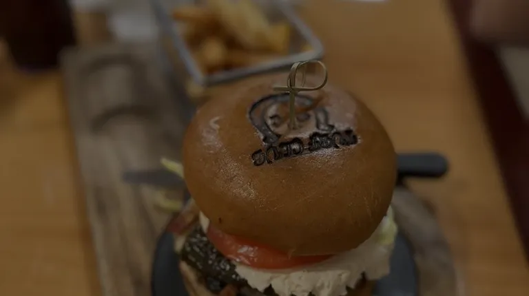 Seattle Slew burger with added lettuce and tomato, skinny fries