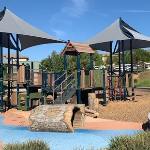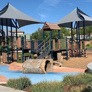 Gorgeous park at the end of the street in a quiet residential area. The playground equipment is all woodsy and nature-themed. Really cool, with lots of unique play areas. Very large field next to the playground with a walking path that loops around it. The path also leads up to the streets and into some of the residential areas, and connects to the bike trail next to the parking lot. Clean bathrooms. There are benches all over the park, including way out by the small trail, and a covered picnic area for parties with 4 benches.