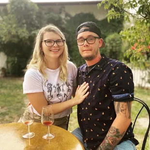 a man and a woman standing in a tasting room