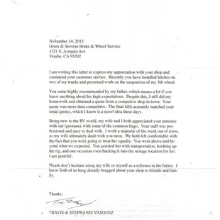 I only wish I should give them a ZERO and here's why. We live in San Diego, however, my husband was raised in Visalia. His mom lived here until she passed recently. We were here doing some estate work and then going on to Sacramento for a family reunion. (Mine). Starting tonight at 7:30. this evening. Running late now for the reasons below. We had some time today so my husband thought he could get get the front end aligned on our RV before we left. He took it this shop at 8:15am. They said it would be ready by 12:30 ish no problem. This allowed us plenty of time to get to Sacto. We were busy and kept thinking they would be calling anytime Finally my husband calls at 3:30. They had NEVER even worked on it!! And they did not have the courtesy to call us to say something came up. A simple explanation and sorry would have sufficed. Nope. They never even called us! AND when my husband dropped it off this am he told the girl at the desk we were just passing through. The reason we were given for nothing being done to our vehicle was that some City vehicles had come in and needed to be worked on. Ok. Sure. I get that. That's maybe their bread and butter and the alignment was not a have to even to us BUT where is your customer courtesy to call us and tell us they couldn't get to it!! We could have picked it up and left on the rest of our trip!! No problem. They didn't do that though. We had to call them!!They were closing in 30 minutes when my husband called them. Were they just going to close up and leave it behind their gates? Were they going to assume that was ok too? I'm still appalled at how in UNPROFESSIONAL this company is. I welcome a response to this review and how you can justify what happened today?00000 That's 5 zeros not stars