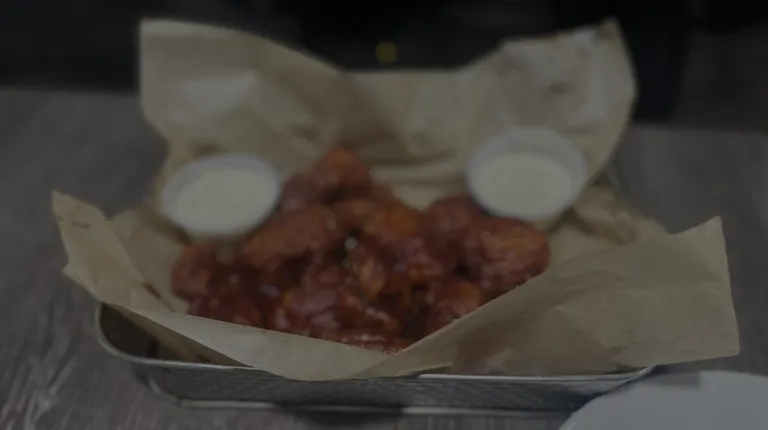 Chicken, Buffalo sauce, mozzarella, cheddar, blue cheese crumbles, and cilantro.