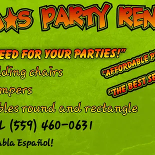 So nice and professional. They don't have phone number to call, but they respond fast to the messages. We rented the water slide with jump house, tables and chairs. They were on time. Clean. Good condition. My party ran late and they had no problem leaving it over night. I definitely recommend them.