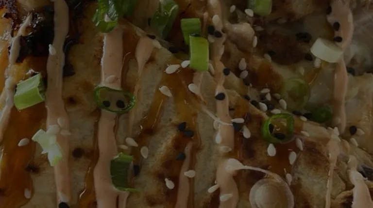 4 grilled chicken tacos with pineapple salsa, sesame seeds, and teriyaki sauce.
