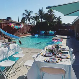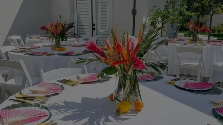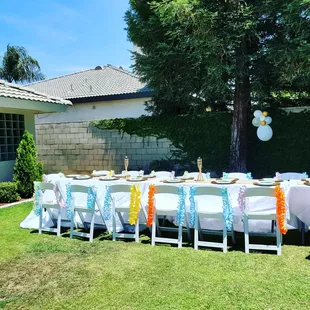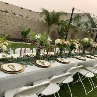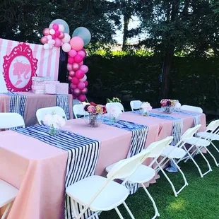 Collaboration with The Picnic Planner featuring our 6 ft. Long Tables, White Resin Chairs, & Long Floor Length Tablecloths in White.