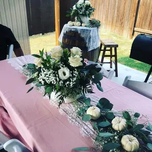 Emily Flower Wall, Long 6 ft. Tables, White Resin Chairs, and Blush/Pink Cheesecloth Table Runners.